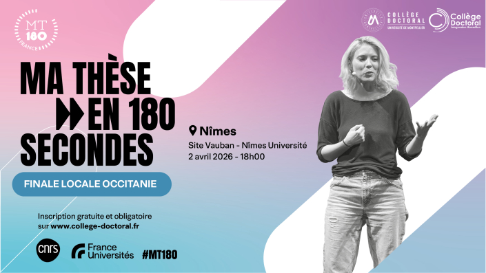 La finale locale Occitanie Est de Ma Thèse en 180 secondes se tiendra le jeudi 2 avril 2026 à 18h dans l’Auditorium de Nîmes Université (Site Vauban). Cet événement incontournable met à l’honneur des doctorantes et doctorants de l’Académie qui relèvent le défi de présenter leur sujet de recherche en seulement trois minutes, avec des mots simples, accessibles à tous.